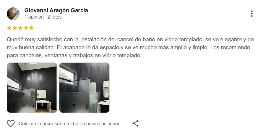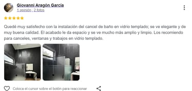 "Quedé muy satisfecho con la instalación del cancel de baño en vidrio templado; se ve elegante y de muy buena calidad. El acabado le da espacio y se ve mucho más amplio y limpio. Los recomiendo para canceles, ventanas y trabajos en vidrio templado"